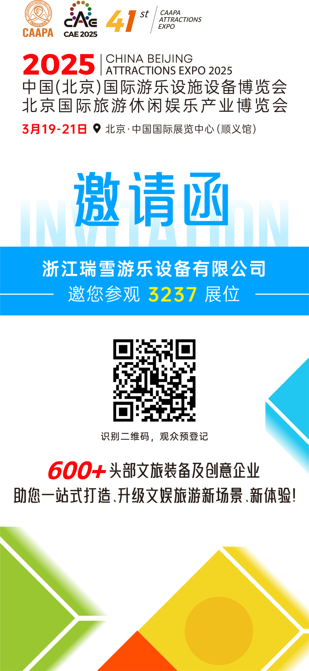 第41届CAAPA博览会-2025中国(北京)国际游乐设施设备博览会(北京国际旅游休闲娱乐产业博览会)将于2025年3月19-21日在北京·中国国际展览中心(顺义馆)举办。展会规模约6万平米,预计参展企业600余家、专业买家预计6万人。本期推荐参展企业:浙江瑞雪游乐设备有限公司