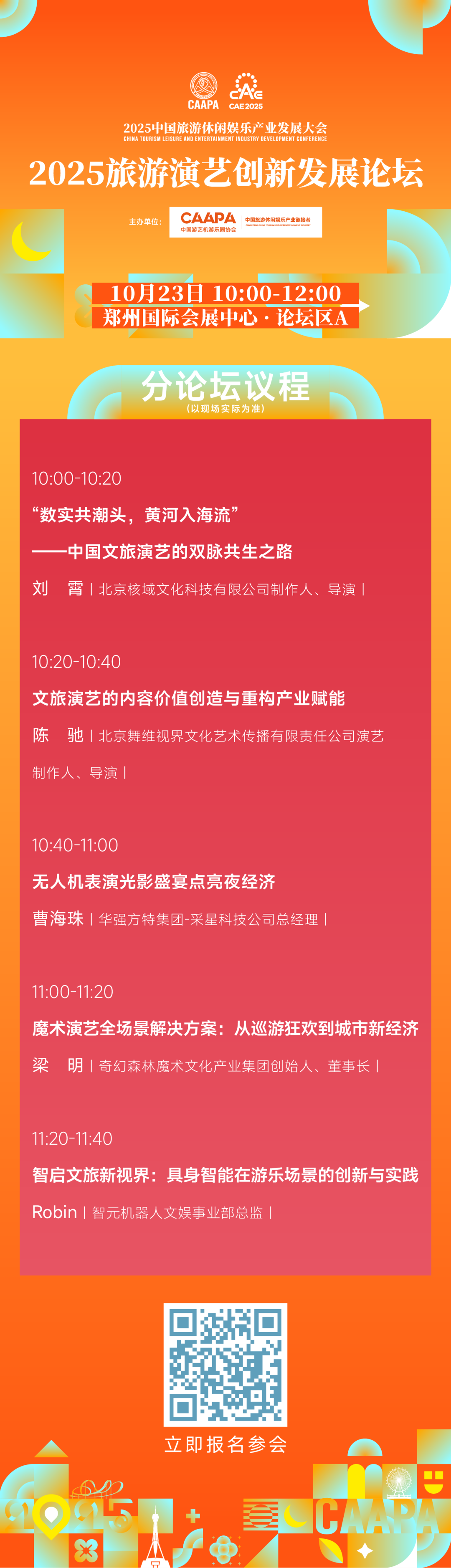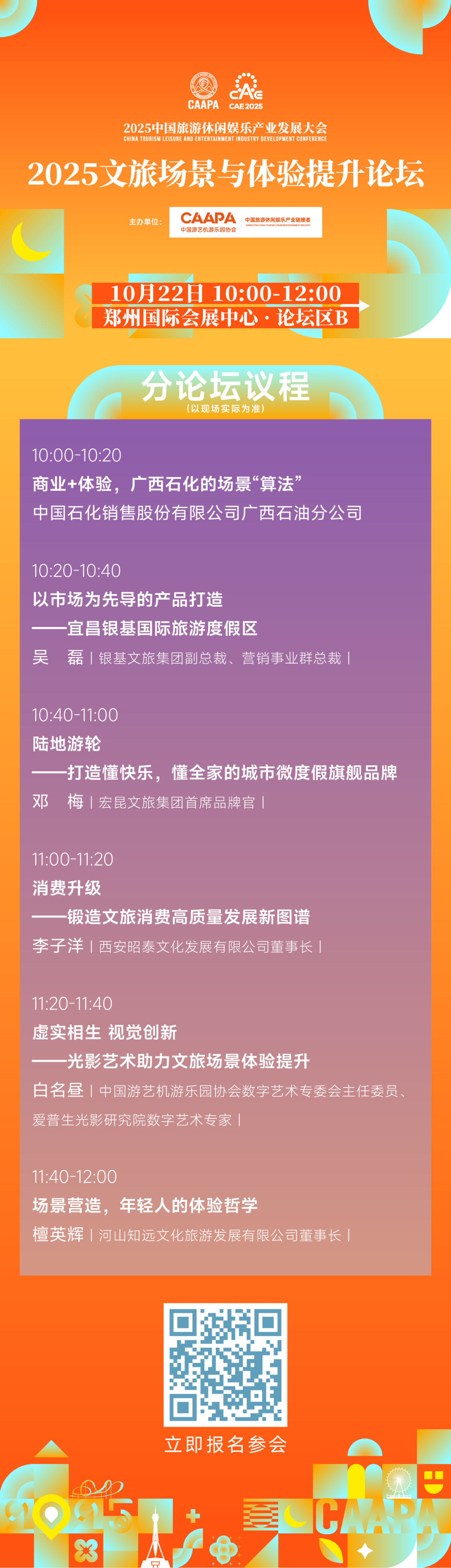 年会设置文旅IP创意创造者论坛、文旅场景与体验提升论坛、主题公园运营提升论坛、文旅项目专家问诊会、文旅新业态新项目分享会、旅游演艺创新发展论坛、文旅创意策划激活论坛、城市公园提质增效论坛、数字艺术创新发展论坛、文旅新消费新趋势洞察论坛、文体旅目的地创新发展论坛等11个专项论坛,并于10月22-24日举办2025中国(郑州)旅游休闲娱乐产业博览会(点此了解博览会),现发布大会完整议程如下: